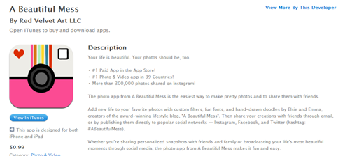 The photo app from A Beautiful Mess is the easiest way to make pretty photos and to share them with friends.Add new life to your favorite photos with custom filters, fun fonts, and hand-drawn doodles by Elsie and Emma, creators of the award-winning lifestyle blog, “A Beautiful Mess”. Then share your creations with friends through email, or by publishing them directly to popular social networks — Instagram, Facebook, and Twitter (hashtag: #ABeautifulMess).Whether you’re sharing personalized snapshots with friends and family or broadcasting your life’s most beautiful moments through social media, the photo app from A Beautiful Mess makes it fun and easy.