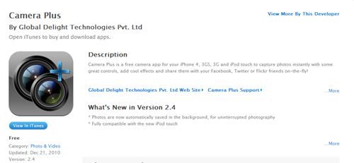 Camera Plus is a free camera app for your iPhone 4, 3GS, 3G and iPod touch to capture photos instantly with some great controls, add cool effects and share them with your Facebook, Twitter or Flickr friends on-the-fly!
