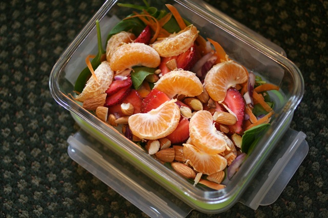 Spinach Salad with Strawberries, a Tangerine, shredded Carrot, Red Onion, and sliced Almonds.