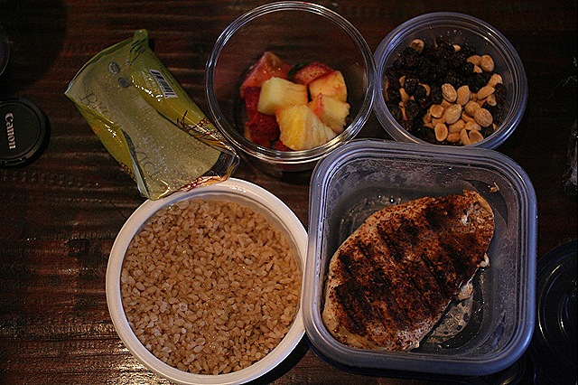 Brown Rice+Chicken+Pineapple+Strawberries+Peanuts and Raisins.