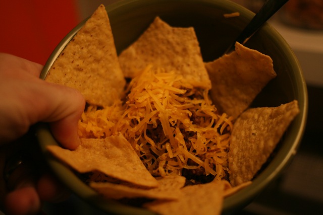 While I went to KB, Hubby made dinner!!! He made us "Real" nachos. He cooked up some of the Organic Beef we got at Costco.