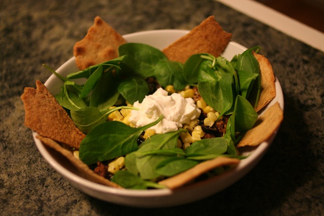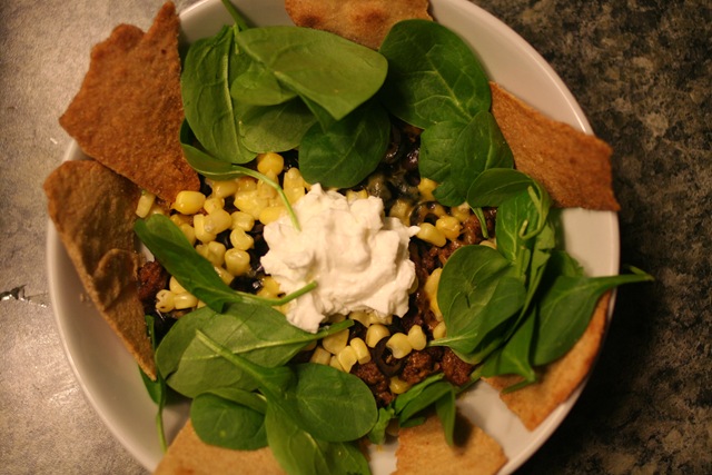 I think this is the best bowl of nachos I have ever eaten, I savored every bite!!! I also added in some organic corn (from Costco), spinach, olives, and Fage.