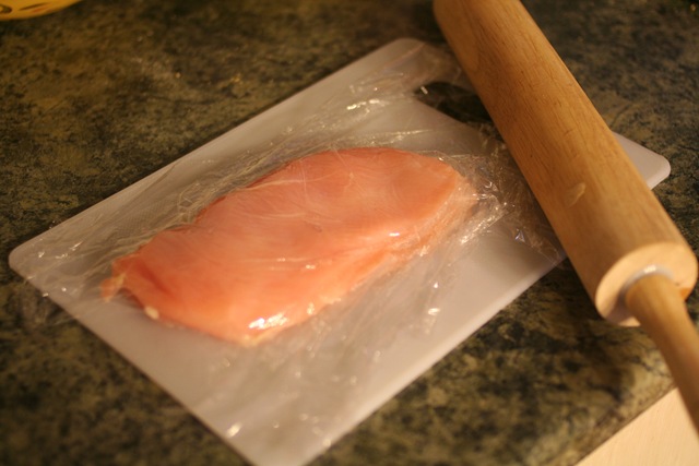 Place chicken on a cutting board and cover with plastic wrap. Then beat the heck out of it with a mallet (I used a rolling pin) until about 2 inches thick. Then cut up into strips.