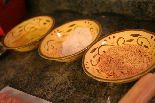 Line up your dipping station. Flour, eggs, and peanuts (then after your our of peanuts switch to almonds).
