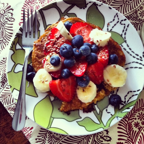 Mix all ingredients together. Heat up griddle to medium high heat and spray with canola oil. Pour mixture onto griddle and watch for bubbles on the ends and then flip. Mix all toppings ingredients together and pour on pancake and enjoy!