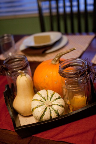 I brought in some veggies from the garden and dressed up two ball jars with a little raffia and candles. I put two small ball jars into two larger jars and lined the big jars with some artificial leaves. I love the simplicity and thriftiness of this piece.