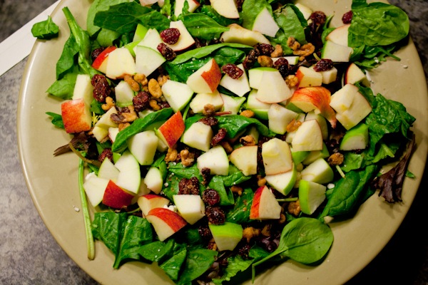 Then onto an amazing a harvest salad. Mixed greens, 1 green apple, 1 cup of pecans, 1 cup of dried cranberries, and gorgonzola cheese.