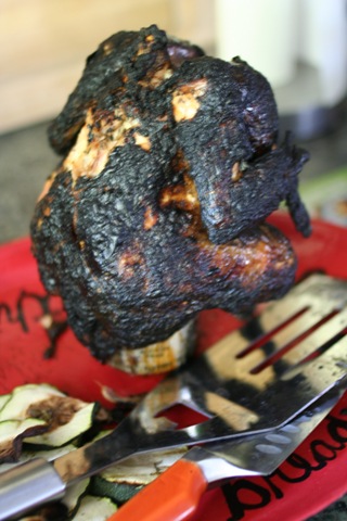 I roasted another whole beer chicken on the grill. This time I forgot to turn the heat down :(รย I quickly remembered and fixed the heat, but the skin got a little toooooo charred! The inside was still good ๐
