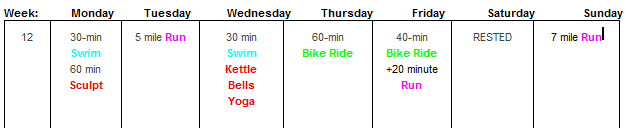 My first week of HIM training went so well!! I really enjoyed mixing it up! I learned this week that I need to spread my bike rides, so I will be doing my Friday bike rides now on Mondays! I am sure I learn something new this week ๐