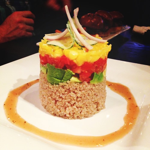 I ordered the Jimmy’s D’s Quinoa Stack; it has a green apple next to the name meaning healthy. It started with pomegranate vinaigrette quinoa, layered with avocado, fresh mango, tomatoes, marinated cucumber slices, red onion slivers, and cilantro. Something that I can make at home for sure, but it was still delish!