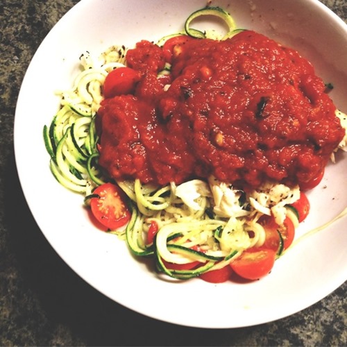 Then I simmered it for an additional 15 minutes to get this consistency and color. I put my marinara on a bed of zucchini noodles!