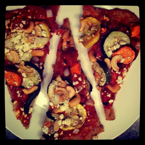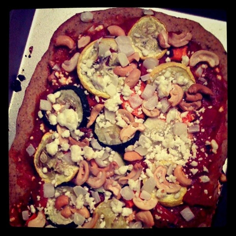 Then add fun toppings. I added grilled zucchini, yellow squash, cashews, roasted tomatoes, grilled white onions, garlic marinara sauce, and goat cheese.