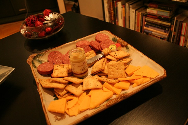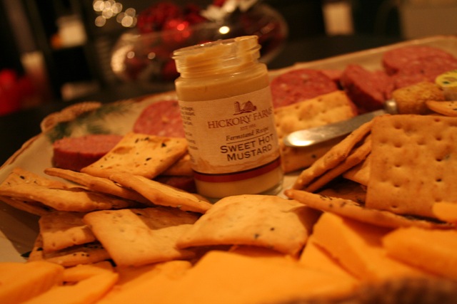 We started the evening with a little cocktail hour! Thanks to Hickory Farms gift box that was sent to me via the Foodbuzz’s Tastesmaster Program, we enjoyed some very yummy treats. One of my favorite products that Hickory Farms is their Mustards!!! This sweet Hot Mustard is at the top of that list!