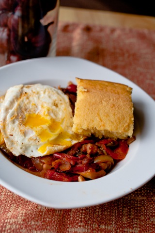 Stir-fry up the peppers and onion and then add in tomato and chili. Top with one sunny side up egg and a piece of leftover cornbread. AMAZING!